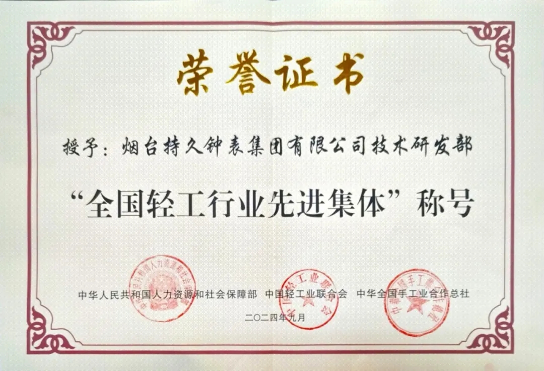 2025年4月10日,全国轻工行业先进集体、劳动模范和先进工作者表彰大会在北京召开。烟台持久钟表技术研发中心凭借突出的创新能力和行业贡献,被授予“全国轻工行业先进集体”荣誉称号。本次评选全国仅118个单位入选,山东省仅有7家企业获此殊荣。