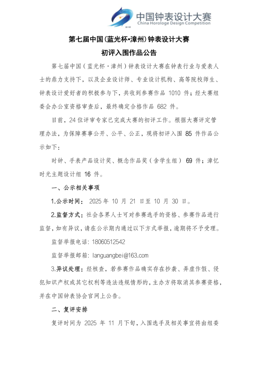 第七届中国(蓝光杯·漳州)钟表设计大赛初评入围作品公告