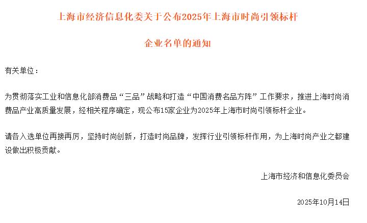 15家企业入选2025年上海市时尚引领标杆企业上海表业上榜