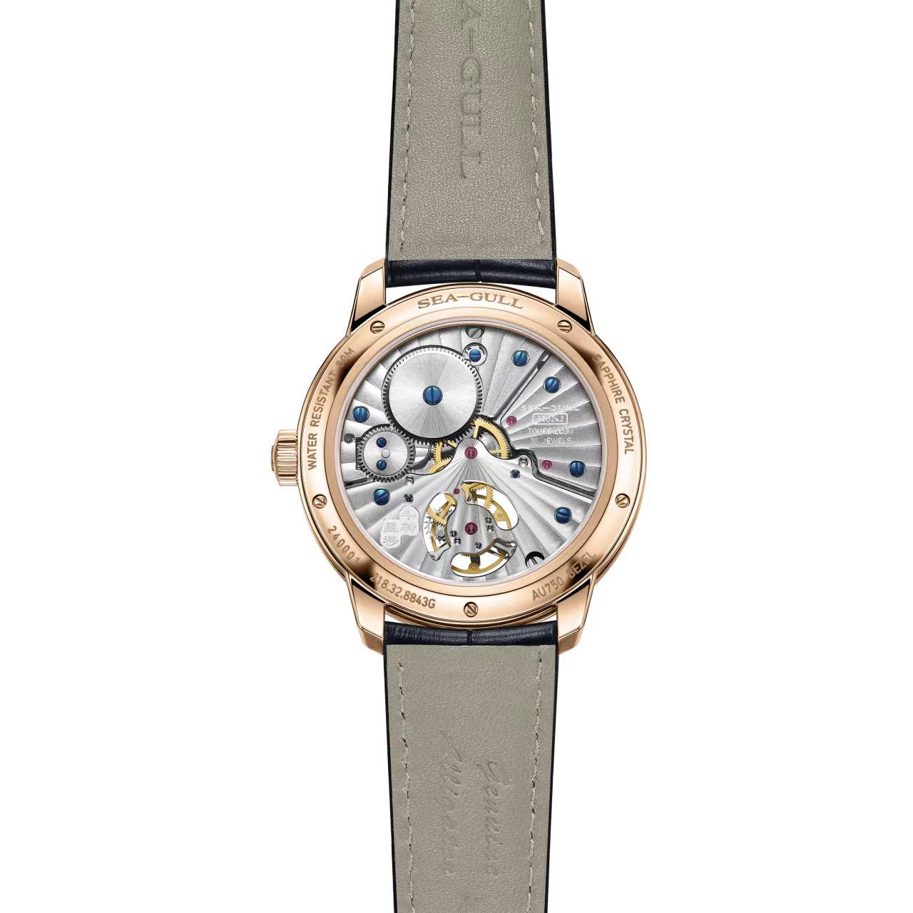 腕表搭载海鸥ST8242自研陀飞轮机芯,6点位的同轴无卡度陀飞轮动态呈现星辰运转的精密美感。搭配透视底盖设计,佩戴者可尽情欣赏机芯的精妙结构和运转之美。