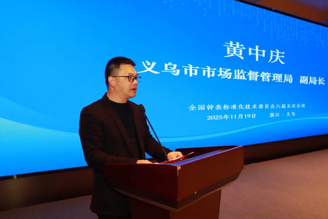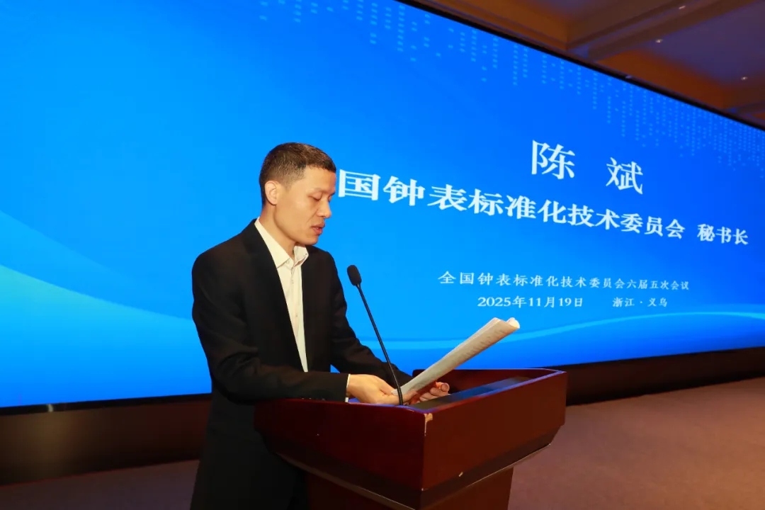 2025年11月18日至20日,全国钟表标准化技术委员会(SAC/TC 160)六届五次会议在义乌市顺利召开。会议由全国钟表标准化技术委员会主办,义乌市标准化研究院、浙江卓越电子有限公司和西安轻工业钟表研究所有限公司共同协办。全国钟表标准化技术委员会主任委员、中国钟表协会理事长张宏光,义乌市市场监督管理局副局长黄中庆,义乌市市场监督管理局标准计量与科技评管科科长王瑜,义乌市标准化研究院院长周江,西安轻工业钟表研究所有限公司党委书记、总经理张晔,广州市钟表行业商会会长林慧琼,义乌市钟表行业协会会长刘效成,浙江卓越电子有限公司董事长王坚等领导和嘉宾出席了本次大会。来自钟表行业企业、大专院校、检测机构和科研院所等80余家单位近100名委员、观察员、标准起草单位代表参加了会议。会议由全国钟表标准化技术委员会秘书长陈斌主持。