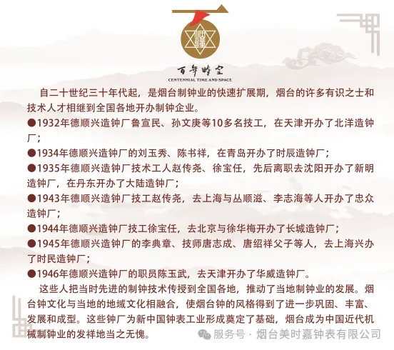 1932 年,德顺兴造钟厂鲁宣民、孙文庚等十余名技工远赴天津,创办北洋造钟厂,拉开了烟钟技术向外输出的序幕。