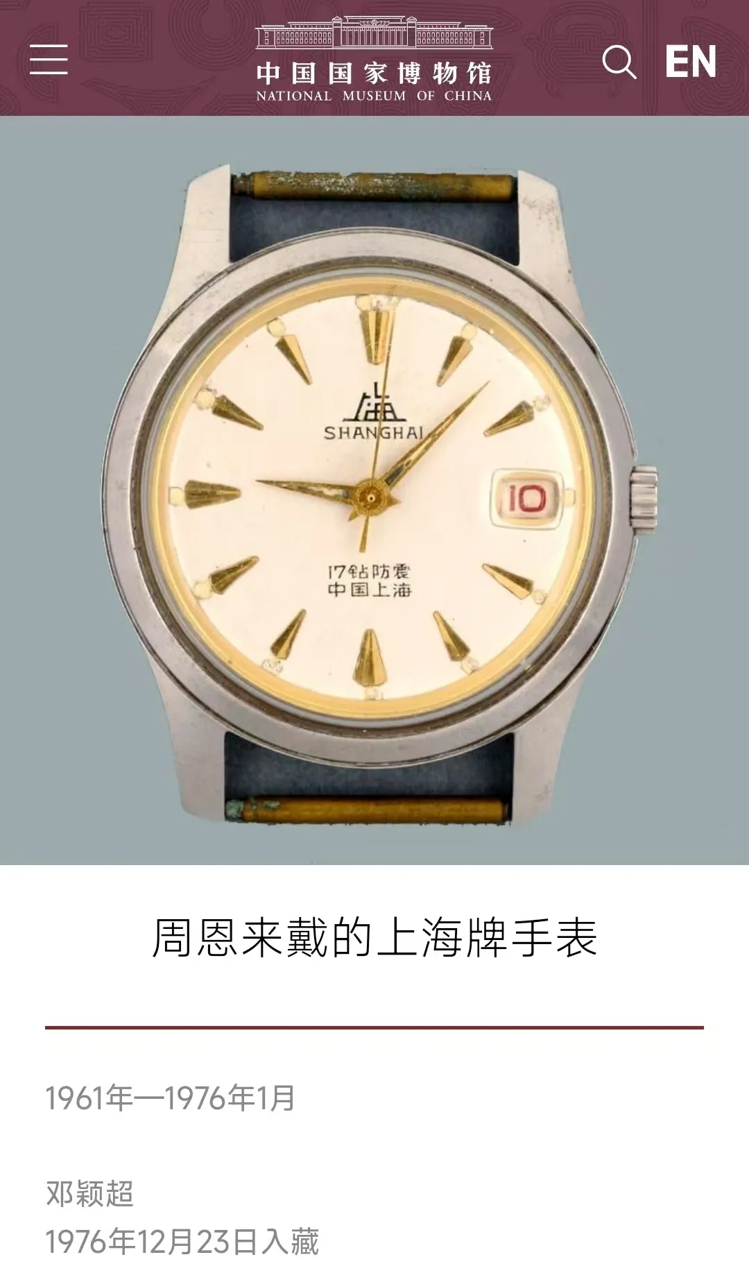 一双手轻轻取下我,指尖带着不舍的温度拂过磨损的表壳,把残留着主人痕迹的我小心翼翼地保存了起来。后来,邓颖超同志将我捐献了出来。