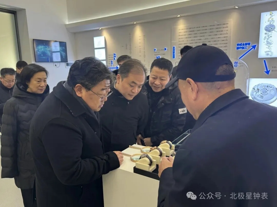 在文化长廊,调研组详细了解北极星自1915年始创以来的百年发展历程,对企业坚守钟表制造主业、深耕精密制造赛道的匠心精神给予高度赞赏。特别是2023年以来,在国丰集团与孔雀表业集团的赋能助力下,北极星紧抓改革机遇,重塑品牌活力,在核心技术攻关、传统工艺革新、高端产品迭代等关键领域持续突破,彰显了民族品牌守望相助、协同共进的深厚情怀。