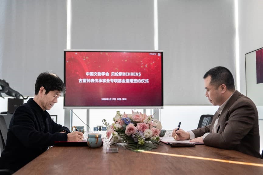 2026年1月18日上午,中国文物学会钟表专业委员会(下称“钟表专委会”)一行四人莅临深圳贝伦斯商贸有限公司(下称“贝伦斯”)考察交流。故宫博物院研究馆员、钟表专委会主任委员王津,专委会副主任委员兼秘书长亓昊楠,副秘书长杨晓晨及委员葛聪组成的专家团队,与贝伦斯负责人林秉强先生就钟表技艺传承、现代制表创新及古董钟表保护等议题展开深度研讨,并共同见证“古董钟表传承事业专项基金”捐赠签约仪式的顺利举行。