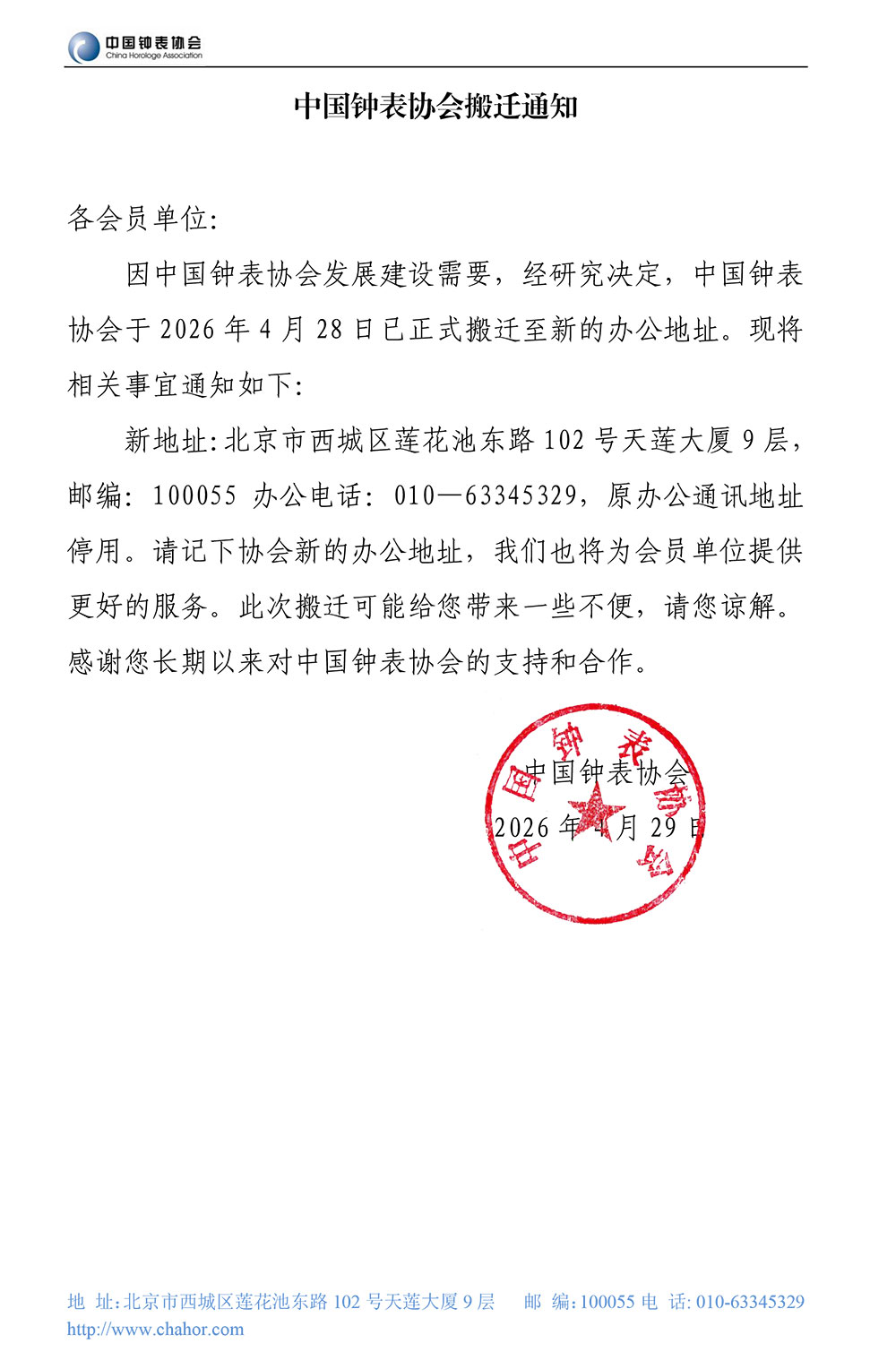 中国钟表协会搬迁通知