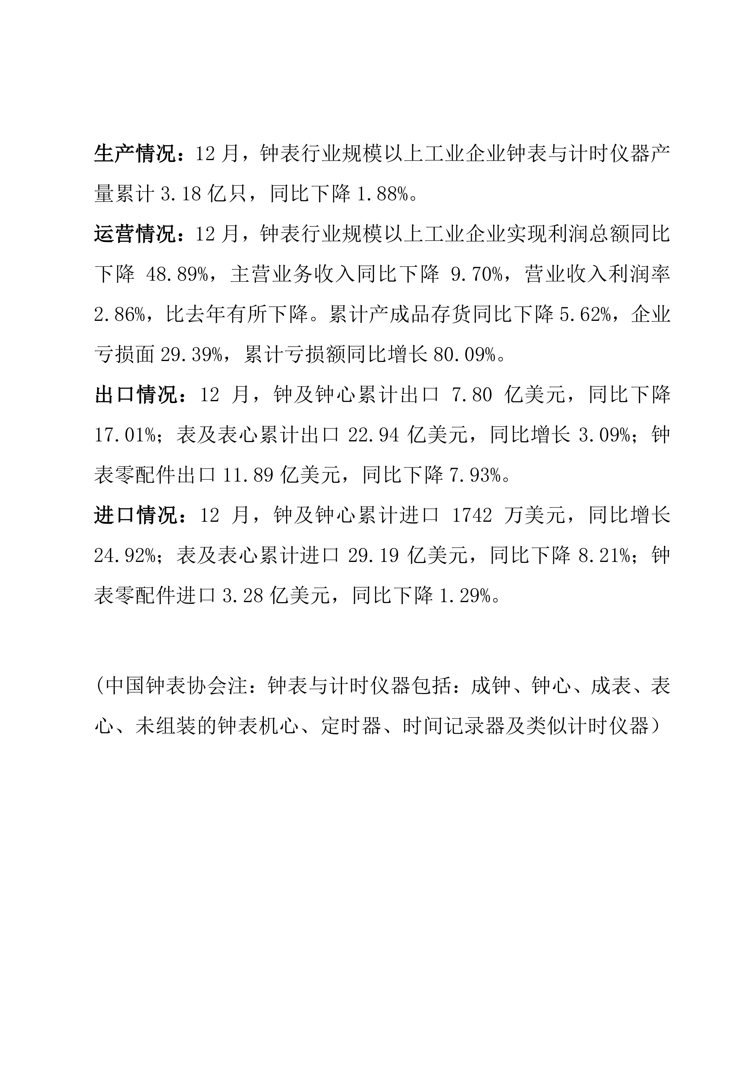 2025年12月钟表行业经济运行简报