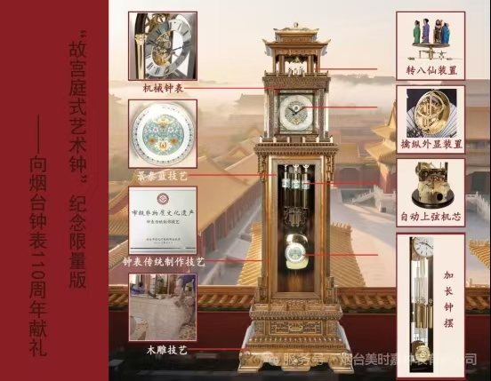 “美时嘉钟表”作为受邀企业,深感荣幸能够在这一面向全球的平台上展现中国钟表业的“文化自信”。今年正值烟台钟表诞生110周年,在此盛会之际,烟台美时嘉钟表有限公司副总经理高力,身为百年烟钟钟表传统制作技艺首批非物质文化遗产传承人、百年烟钟群体性传承第七代传承人,出席本次会议。他颇为自豪地向全球山东人推介纪念限量版“故宫庭式艺术钟”,该款钟表全球限量发行十台。
