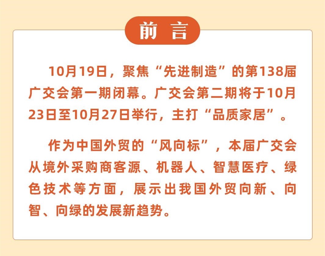 第138届广交会第一期电子展以“先进制造”为主题,展示了中国电子家电、工业制造等领域的创新成果,参展企业反馈效果显著,订单与机遇双丰收。