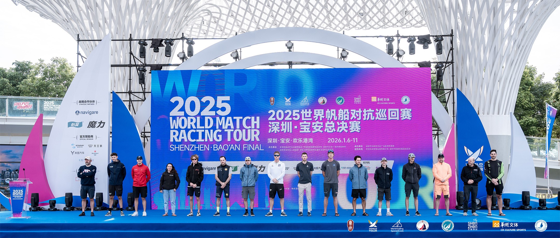 1月6日上午,赛事开幕仪式隆重举行。世界帆船联合会主席李全海,世界帆船联合会副主席索菲亚·帕帕米查洛普洛斯,世界帆船对抗巡回赛组委会执行主席克里斯·李,世界帆船对抗巡回赛组委会执行董事詹姆斯·普莱森斯,中国帆船帆板运动协会副主席傅丹青,深圳市文化广电旅游体育局副局长何建辉,宝安区委区政府及相关部门领导,前海合作区党工委副书记梁珂,华润文化体育发展有限公司总经理兰小军等嘉宾共同出席,并携手启动赛事装置。16位世界顶尖船长悉数亮相,正式拉开这场海上“速度与激情”的竞技序幕。