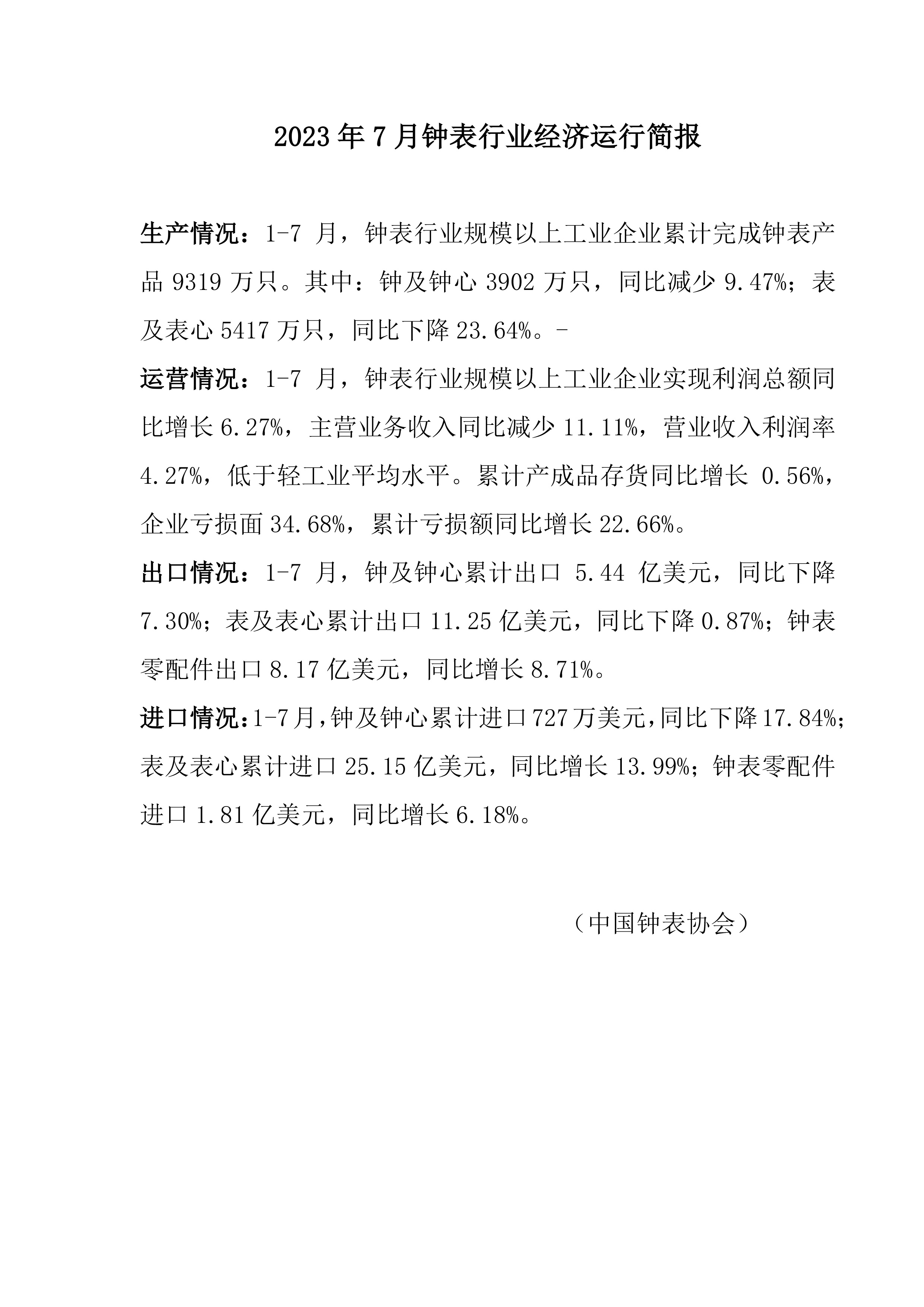 2023年7月钟表行业经济运行简报